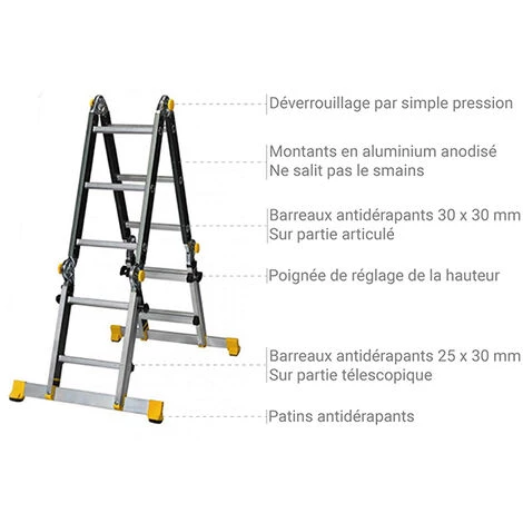 – Echelle télescopique qui permet un réglage de la hauteur barreau par barreau.