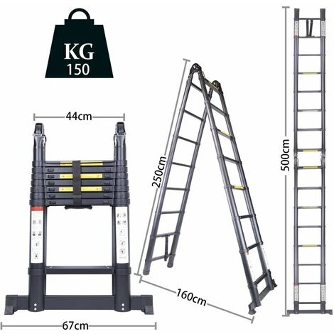 Hauteur dépliée: 5M, hauteur pliée: 93cm, taille de repliée: 93*48cm. Vous pouvez plier l’échelle escabeau télescopique 5m en deux, couper chaque extrémité une par une ou l’étendre jusqu’à 2,5 m. Il y a un total de 16 étapes.