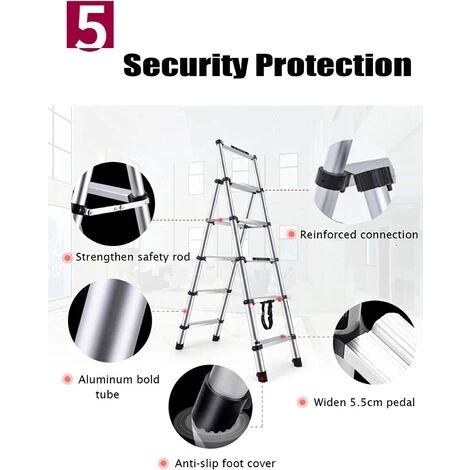 Il peut être utilisé comme échelle télescopique, échelle à double marche, échelle à marche d’escalier et comme deux ponts d’échafaudage. Sangle robuste pour la fixation pour un meilleur stockage. EN 131 est la norme de sécurité de l’Union européenne pour les échelles domestiques.