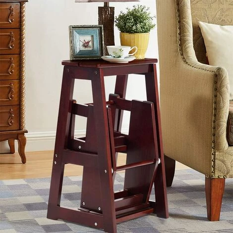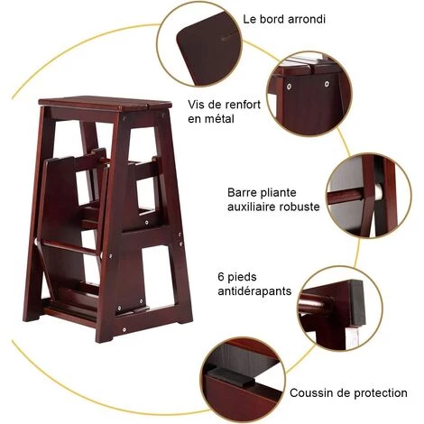 - Multifonction – avec cet escabeau pratique, vous pouvez facilement prendre des articles en haut, changer l’ampoule au plafond ou nettoyer la fenêtre etc. Il peut aussi servir de tabouret avec de différentes hauteurs. De plus, vous pouvez le prendre pour petite étagère, y mettre par exemple des pots de fleurs en vue d’embellir votre maison.