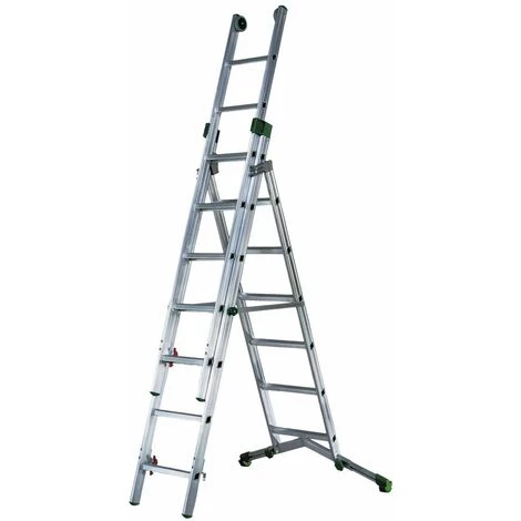 Échelle en aluminium transformable à deux plans ou à trois plans.