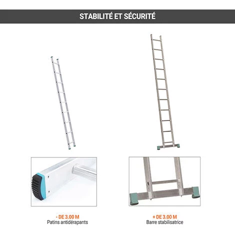 – Les échelles de plus de 3.00m de long sans la barre stabilisatrice sont en dehors du champ de la norme EN 131 du fait de leurs longueurs.