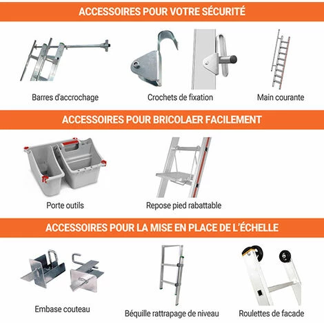 – Accessoires pour la mise en place de l’échelle : béquille pour rattraper le niveau, embase couteau…
