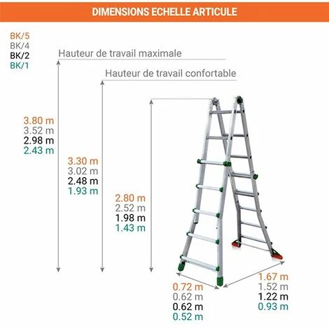 – La hauteur de travail confortable correspond à la longueur de l’échelle plus 50cm maximum.