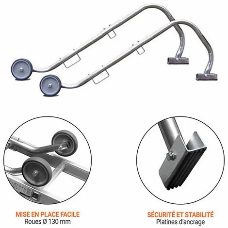 – Roues de Ø 130mm pour faire rouler l’échelle sur le toit et la retourner pour une mise en place facile.