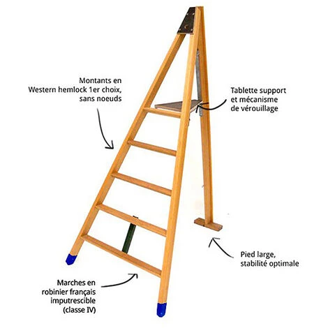 – Echelle fruitière en bois de qualité: montant en western hemlock clear canadien et marches en robinier français.