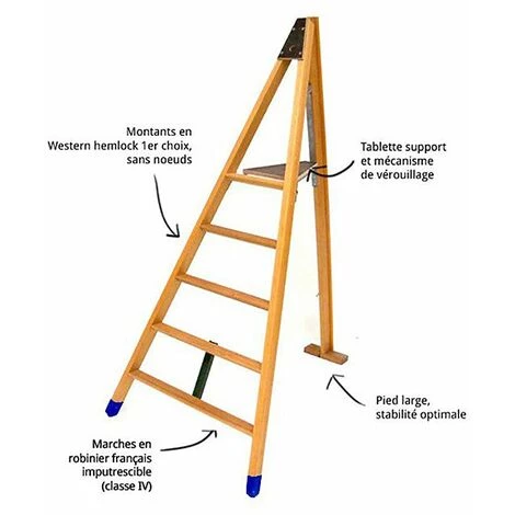 – Echelle fruitière en bois de qualité: montants en western hemlock clear canadien et marches en robinier français.