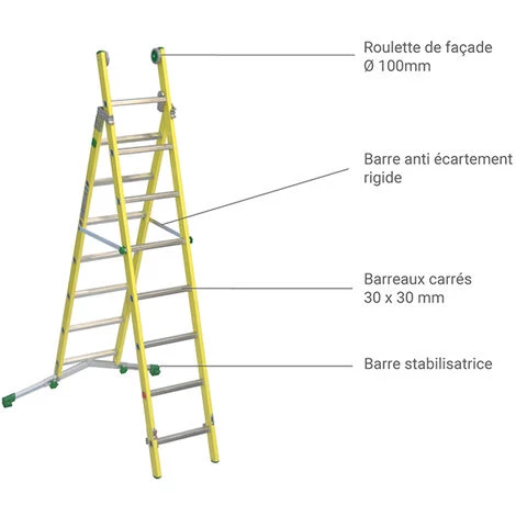 – Echelle isolante transformable car elle peut s’utiliser soit en position escabeau soit en échelle double.