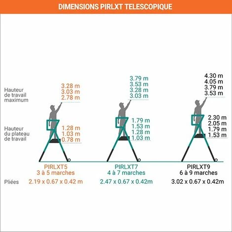 – Escabeau télescopique pour escalier réglable à 3 ou 4 hauteurs différentes selon le modèle avec un réglable possible à chaque marche.