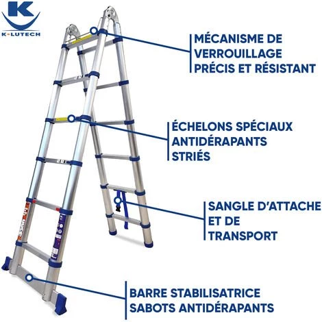 QUALITÉ: Notre escabeau est conçu en aluminium pour allier légèreté et solidité de façon optimale. Il est prévu pour un usage professionnel intensif – Certifié pour une charge max de 150Kg et testé à 300Kg avec succès PRATIQUE: Porte outil en ABS bien pensé et muni d&rsquoun crochet à seau – poignée ergonomique pour faciliter son transport. SÉCURITÉ: Afin d&rsquoaugmenter la sécurité, notre esabeau est muni d&rsquoune biellette en ABS pour le blocage de plateforme en position ouverte, ainsi que d&rsquoune biellette de blocage en position fermée pour éviter une ouverture intempestive pendant le transport. Les sabots anti-dérapants sont rivetés. Sangles de sécurité CONFORT: Marches anti-dérapantes de 10cm de profondeur. Plateforme ultra stable et verrouillable. Poignée de transport. NORMES : GS – EN131 – CE )