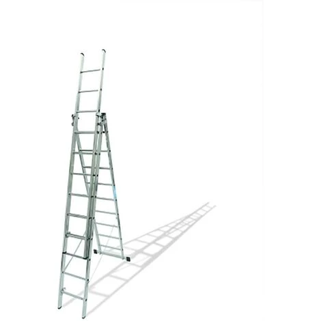 Echelle triple transformable avec base 3×9 peld. Fabriqué en tube de 73×25 mm. Fourni avec 4 supports et un verrou de sécurité. Embouts antidérapants en PVC. Triple système coulissant en aluminium emboîté sur les barres transversales. Base stabilisante. Distance entre les marches 280 mm. Hauteur de travail 7,46m