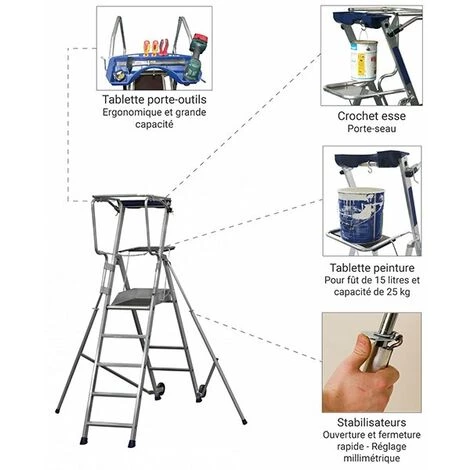 – Marches antidérapantes profondes de 8cm, stabilisateurs réglable au millimètre et mise en place rapide.
