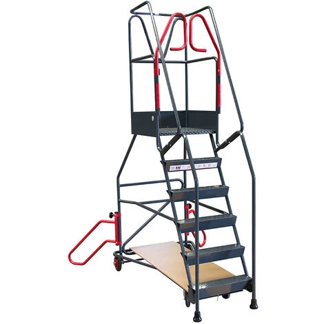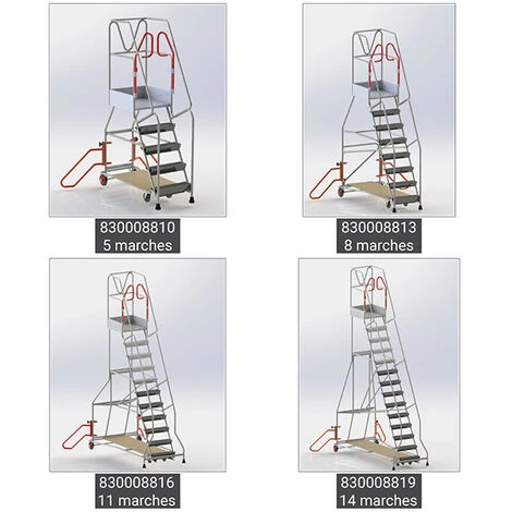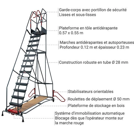 – Escabeau en acier avec garde-corps et portillon de sécurité afin d’éviter les chutes de hauteur et accidents du travail.