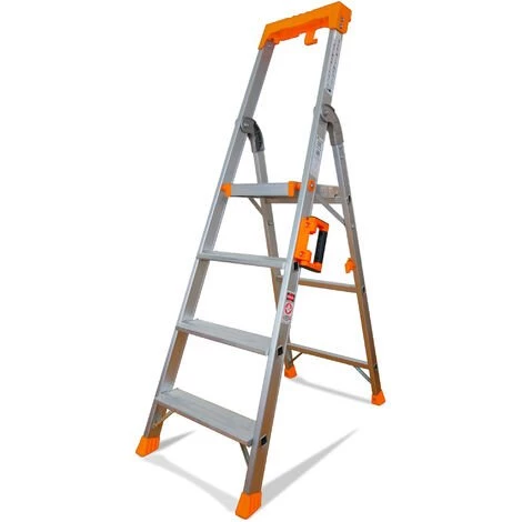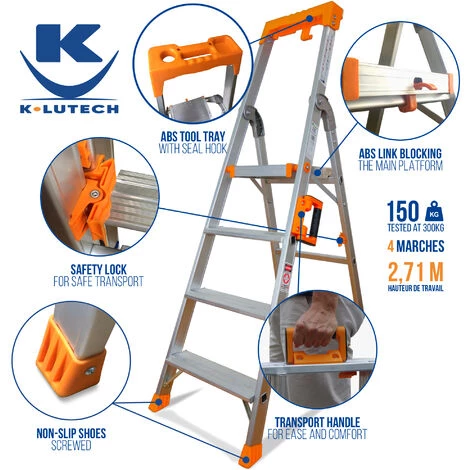 QUALITé : Notre escabeau est conçu en aluminium pour allier légèreté et solidité de façon optimale. Il est prévu pour un usage professionnel intensif – Certifié pour une charge max de 150Kg et testé à 300Kg avec succès PRATIQUE : Porte outil en ABS bien pensé et muni d’un crochet à seau – poignée ergonomique pour faciliter son transport. SéCURITé : Afin d’augmenter la sécurité, notre esabeau est muni d’une biellette en ABS pour le blocage de plateforme en position ouverte, ainsi que d’une biellette de blocage en position fermée pour éviter une ouverture intempestive pendant le transport. Les sabots anti-dérapants sont rivetés. Sangles de sécurité CONFORT : Marches anti-dérapantes de 10cm de profondeur. Plateforme ultra stable et verrouillable. Poignée de transport. NORMES : GS – EN131 – CE )