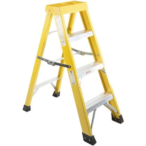 Escabeaux en fibre de verre. L’escabeau en fibre de verre de RS Pro ne conduit pas l’électricité, et les montants robustes renforcés le rendent extrêmement durable. S’inclinant vers l’arrière, l’escabeau est doté de marches antidérapantes sur un côté, qui sont doublement rivetées pour plus de sécurité. L’escabeau de RS Pro est conforme à la norme EN131, qui garantit une charge statique nominale de 150 kg. La dernière marche de l’escabeau est dotée d’un rack à outils pratique pour ranger les outils les plus utilisés pour éviter d’avoir à descendre de l’escabeau. Caractéristiques et avantages. Escabeau idéal pour les électriciens. Plastique non conducteur renforcé de fibre de verre. Plateau à outils pratique avec suffisamment d’espace pour les outils. Connexion rigide et solide sur les deux côtés. Marches en aluminium à deux rivets. Pieds en plastique antidérapants. Applications types. Peinture et décoration. Perçage d’orifice. Installation d’éclairage. Accès de grenier. FAQ. Pourquoi acheter un escabeau en fibre de verre ?. Le principal avantage d’un escabeau en fibre de verre par rapport aux équivalents en métal est sa résistance aux flammes et à l’électricité. C’est le choix des électriciens pour le travail à proximité de sources à haute tension, car il peut résister à 25 – 30 000 V. Les escabeaux en fibre de verre sont extrêmement résistants aux intempéries, ne sont pas affaiblis par le soleil et ne s’oxydent pas ni ne rouillent. Qu’est-ce que la norme EN131 ?. La norme EN131 est une certification de l’Union européenne pour les escabeaux et les échelles portables. Depuis le 1er janvier 2018, il existe une norme avec 2 classifications : EN131 professionnel EN131 non professionnel La norme couvre les exigences supplémentaires de stabilité, de glissement, de durabilité et de résistance en position. Est-il sûr de se tenir debout sur la plate-forme d’un escabeau ?. La capacité de se tenir debout sur la plate-forme est déterminée par la présence d’une rampe au-dessus de la plate-forme de l’escabeau. Les HSE conseillent d’éviter de se tenir debout sur les trois dernières marches, tandis que la norme EN131 estime qu’il faut éviter sur les deux dernières marches, s’il n’y a pas de plate-forme.