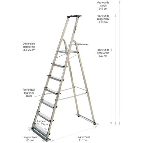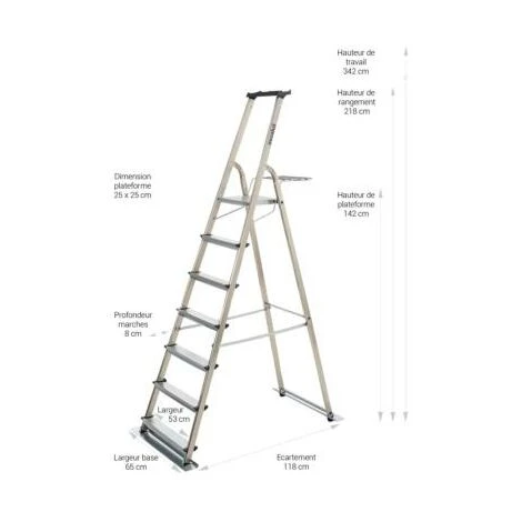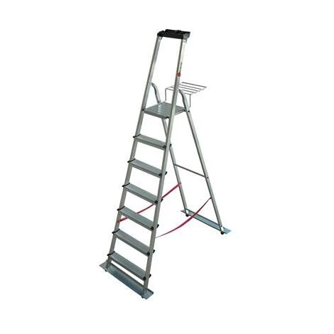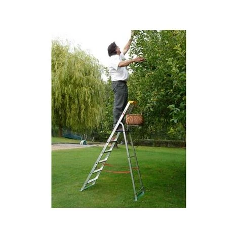 - Escabeau JardiMixte 7 marches, pour le jardinage et l’extérieur, plateforme et marches en acier zingué, articulations par crosses monoblocs, 2 bases stabilisatrices amovibles pour une utilisation sur sol extérieur meuble, les embouts antidérapants sont interchangeables, équipé du système breveté anti basculement SAB, stabilité maximale avec les sangles de sécurité, charge maximale 150 kgs (testé à 260 Kgs)