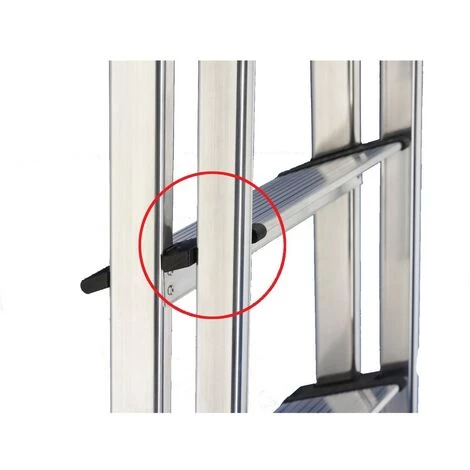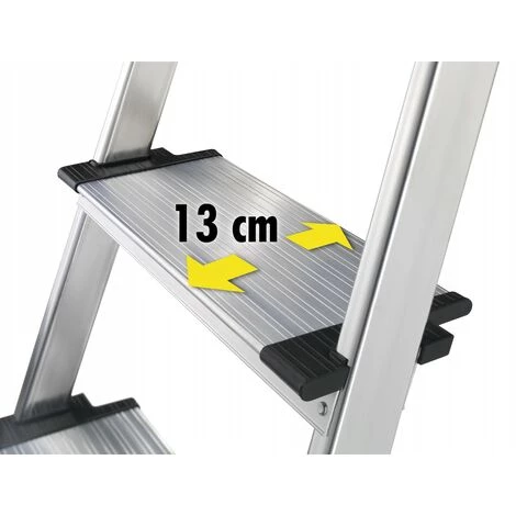 Escabeau aluminium XXL. Il dispose marches larges (13 cm) à striures antidérapantes pour vous offrir une stabilité optimale.Il possède également une tablette porte-outils avec crochet porte-seau et serre-câbe, une protection anti-pincement des doigts, une plateforme aluminium avec striures antidérapantes, d’une liaison de sécurité marche-montants à rivetage haute technologie et de sabots emboitables antidérapants.Marches et plateforme avec retour de matière pour éviter les coupures.Charge max admissible : 150 kg Hauteur Max. d’accès : 2.60 m