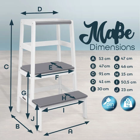 La tour d’apprentissage KIDUKU répond à toutes les exigences de sécurité conformément à la norme DIN EN 71-3. Le vernis est compatible avec les aliments et la salive. Des barres transversales supplémentaires assurent une stabilité maximale.