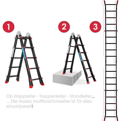Les profilés en aluminium extrudé rectangulaires fournissent un degré très élevé de résistance , en dépit de son faible poids .L’échelle multifonction peut être utilisé comme :- Escabeau- Ladder- Escabeau- Plates-formesPeu encombrant , léger et très polyvalent échelle – la qualité de la marque par Masko®Détails techniques barreaux en 4×3– Poids: 8,2 kgDimensions:– Hauteur Collapsed = 92cm- Hauteur étendue = 141cm / 57cm de large- Max élargi . Longueur = 290cmDétails techniques barreaux en 4×4- Poids: 9,9kgDimensions :- Hauteur Collapsed = 120cm- Hauteur étendue = 194cm / 75cm de large- Max élargi . Longueur = 400cmDétails techniques barreaux en 4×5– Poids: 11,6kgDimensions:– Hauteur Collapsed = 148cm- Hauteur étendue = 247cm / 92cm de large- Max élargi . Longueur = 510cmDétails techniques barreaux en 4×6– Poids: 13,3kgDimensions:– Hauteur Collapsed = 176cm- Hauteur étendue = 300cm / 110cm de large- Max élargi . Longueur = 625cm
