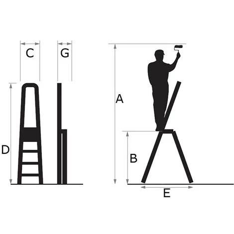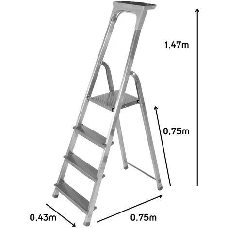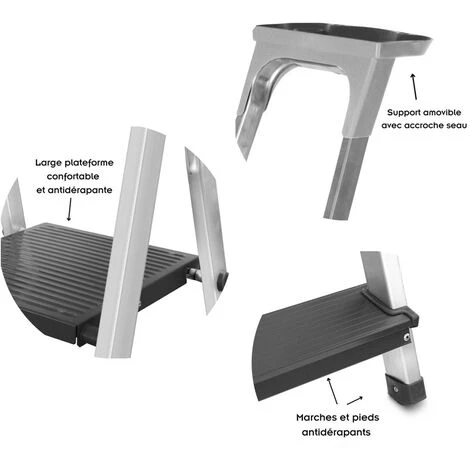 Escabeau en aluminium avec plateforme de travail et larges marches antidérapantes.