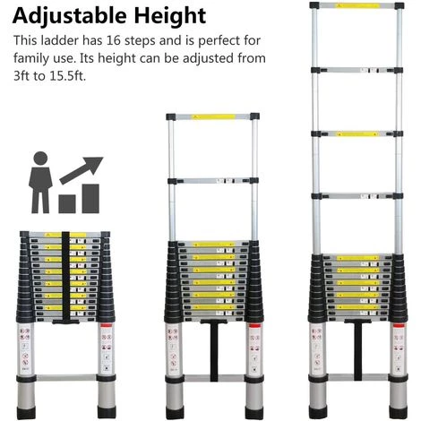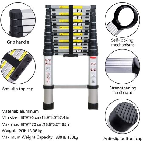 Ne soyez plus jamais à court d’échelle ! Cette échelle télescopique peut rentrer dans votre voiture ou dans la boîte à outils d’un utilitaire, pour être ensuite sortie sans problème pour accéder aux endroits difficiles d’accès. S’utilise sans aucun effort. Son poids léger vous permet de la transporter partout facilement, et le fait qu’elle soit télescopique vous permet de la ranger partout facilement. Très durable et sûre d’utilisation. Peut être utilisée à l’intérieur et à l’extérieur.