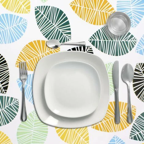 – Nappe en caoutchouc estampée d’un fond blanc avec des formes de feuilles dans diverses nuances de couleurs. Design moderne et élégant pour toutes les occasions.