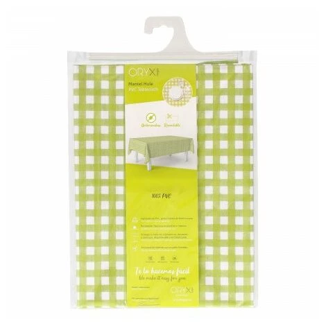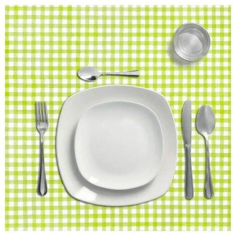 – Tovaglia in gomma stampata color lime con quadrati bianchi. Design moderno ed elegante per ogni occasione.