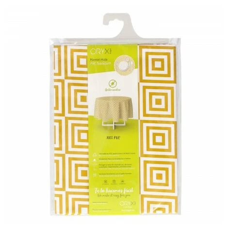 – Tovaglia in gomma stampata in bianco con forme a rombo giallo. Design moderno ed elegante per ogni occasione.