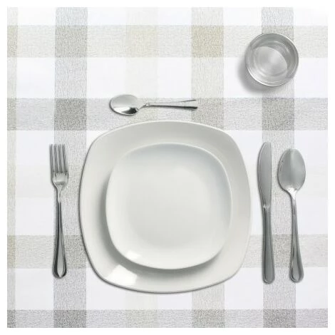 – Tovaglia in gomma stampata in bianco con forme quadrate nei toni del beige e del grigio. Design moderno ed elegante per ogni occasione.