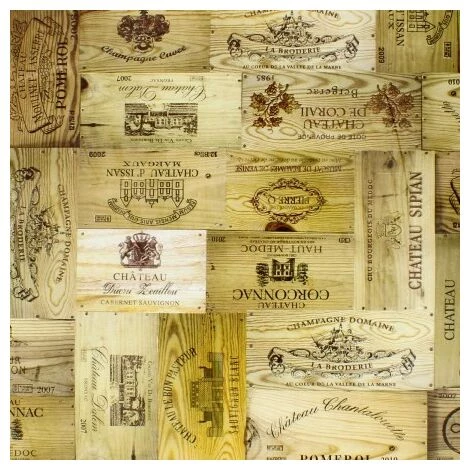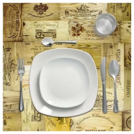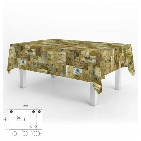 – Tovaglia di gomma stampata in madera colore che imita una composizione di scatole di vino. Design moderno ed elegante per ogni occasione.