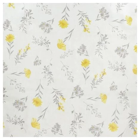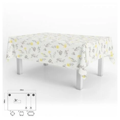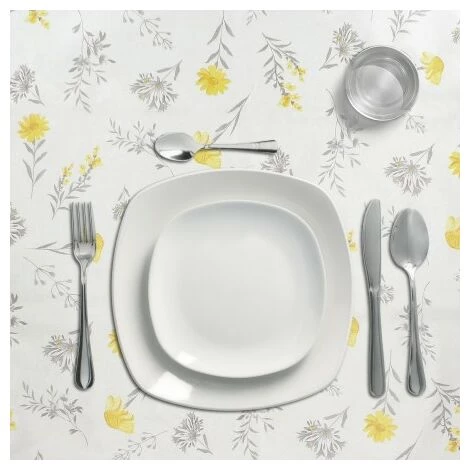 – Tovaglia in gomma stampata in colore grigio con forme di fiori gialli. Design moderno ed elegante per ogni occasione.
