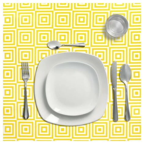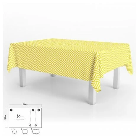 – Tovaglia in gomma stampata in bianco con forme a rombo giallo. Design moderno ed elegante per ogni occasione.