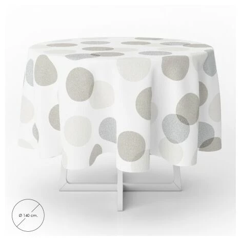 – Tovaglia in gomma stampata in bianco con forme circolari nei toni del grigio e del beige. Design moderno ed elegante per ogni occasione.