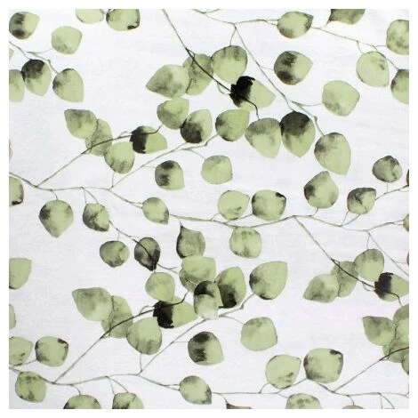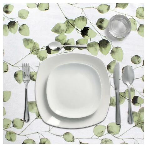 – Tovaglia in gomma stampata in grigio con forme di foglie e rami in verde. Design moderno ed elegante per ogni occasione.