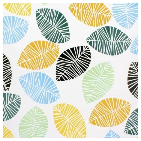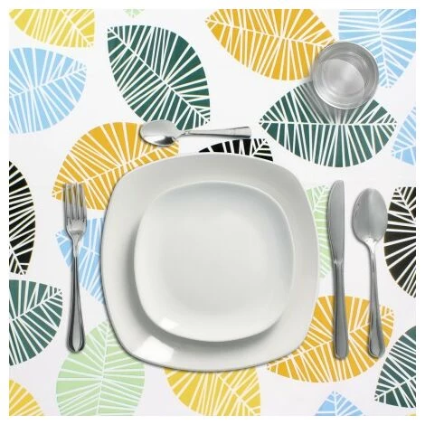 – Tovaglia in gomma stampata con fondo bianco con foglie di forme in varios sfumature di colore. Design moderno ed elegante per ogni occasione.