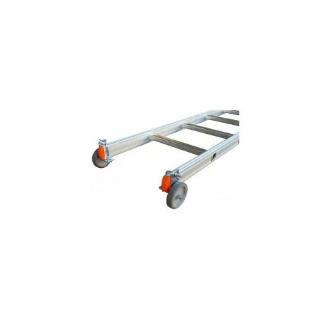 Paire de roulettes se fixant sur l’extrémité des montants d’une échelle, et permettant de : – Faire monter plus facilement une échelle à plusieurs plans en la laissant appuyée contre le mur. – Transporter sans effort une échelle en la tirant ou la poussant comme une brouette. Fixation par vis papillon. Diamètre des roulettes : 100 mm. Section maximum des montant de l’échelle : 70 x 35 mm.
