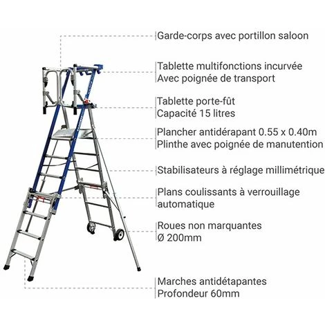 – Idéal pour les peintres grâce au crochet porte-seau et à la tablette porte-fût, l’espace de travail est optimisé.