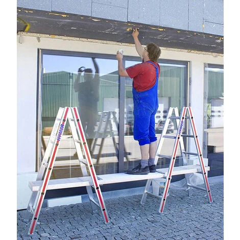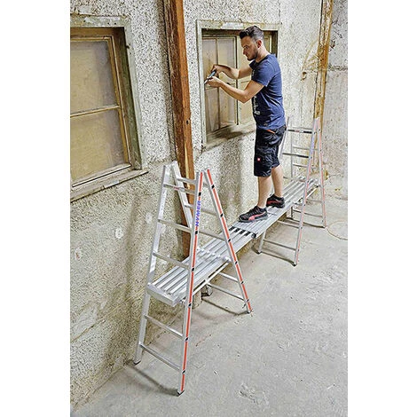Le plan de travail se pose sur tous les échelons de l’échelle. Dans la limite du 3éme échelon en partant du sommet de l’échelle soit une hauteur admissible maximum pour la plateforme de 1.00m