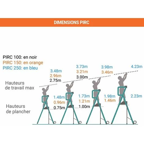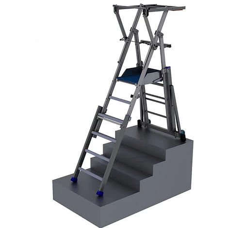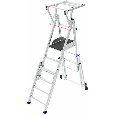 – Plateforme télescopique réglable à plusieurs hauteurs et peu encombrant grâce au garde-corps rabattable.
