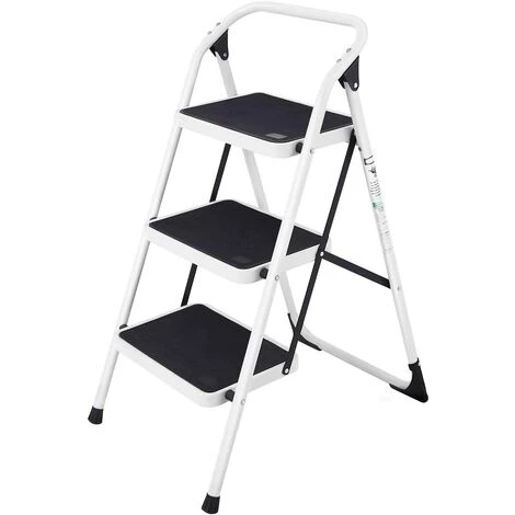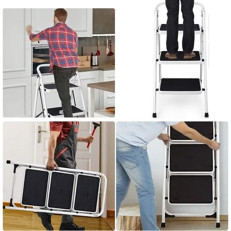 RELAX4LIFE Escabeau Pliable En Fer Avec Structure Stable, Marchepied Échelle Pliante Avec Poignée Et Pied Antidérapants, Capacité De 150 Kg (3 Marches Avec Blanc Poignée)
