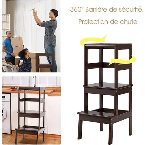 Malgré petits, les enfants qui sont curieux de tout ont envie de s’intégrer dans le monde des grands. Le rêve se réalise avec ce produit. Par 2 marches, les petits monte sur le palier de l’escabeau à hauteur de lavabo ou de table, ils ainsi font le brossage ou lavage tout seul. Bonne chance à accoître leur autonomie. En même temps, ils se forme à l’art de cuisine lors de l’observation sur la tour. Quant à la sécurité, la barrière, les pétales larges et la fabrication en bois… Aucune inquiétude !