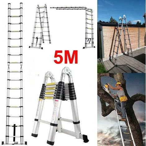 Échelle Télescopique Pliante 5M (2,5M + 2,5M) Escabeau Télescopique en Aluminium 16 Echelons Charge Max 150 kg