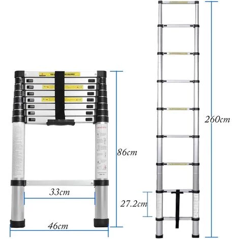 【Matériel】Construit en alliage d’aluminium léger et durable pour une capacité de 150 kg. Hauteur d’échelle: 2.6 M. Certifié conforme à la norme de sécurité européenne EN131, CE et SGS. Remarque: Ne montez jamais et ne vous tenez pas debout sur les trois premiers barreaux, car vous risqueriez de perdre votre blance.