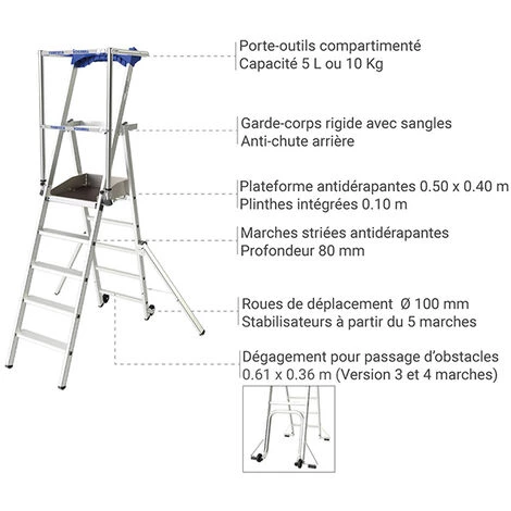 – Dégagement avant pour passage d’obstacles 0.61 x 0.366 m, pour les escabeaux 3 et 4 marches.