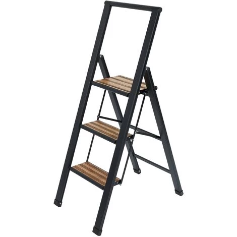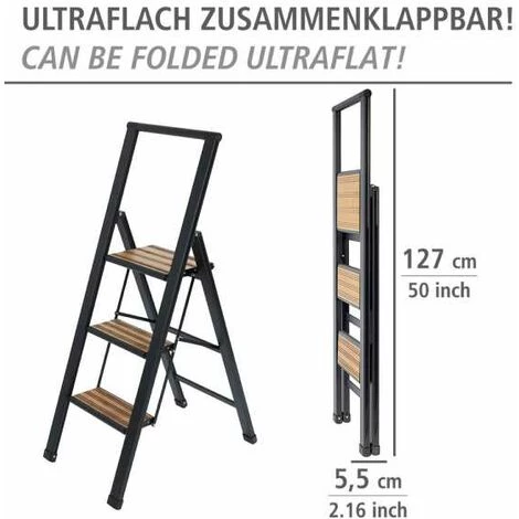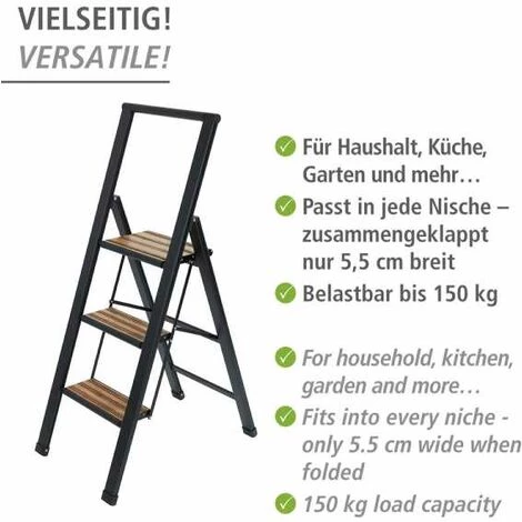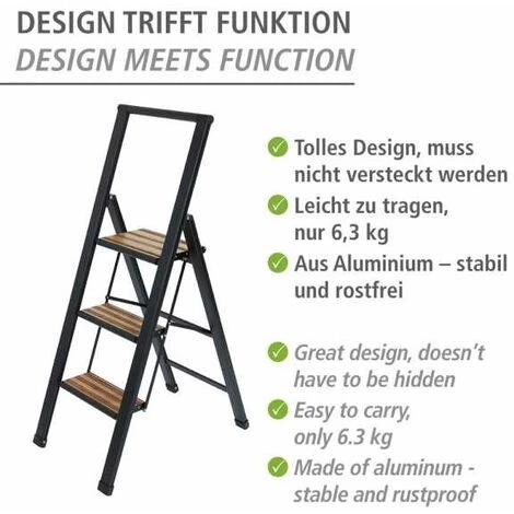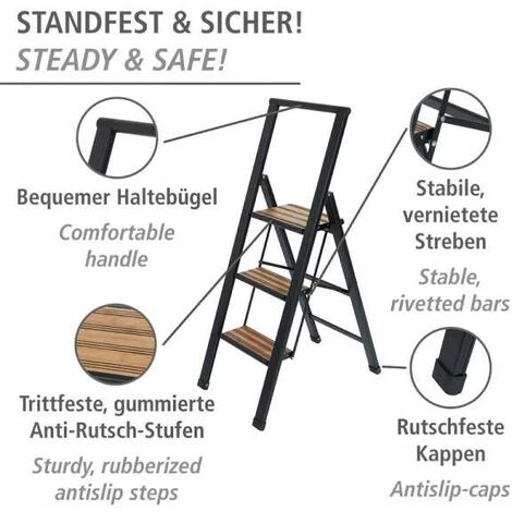 L’escabeau 3 marches design en aluminium de WENKO, assure une posture sécurisée lors de tous les travaux en hauteur. Qu’il s’agisse d’accrocher des des rideaux, de nettoyer des fenêtres ou d’effectuer des travaux de jardinage, l’escabeau ingénieux garantit une stabilité optimale pour une hauteur de plateforme de 75 cm – plus besoin de se tenir en équilibre ou de risquer la chute. L’étrier de sécurité supplémentaire garantit un maintien fiable de l’escabeau 3 marches. Ici, un design tendance est allié à un haut niveau de sécurité. Une montée et une descente facile sont aussi garanties par les marches XXL (surface d’appui de 31,5 cm x 23 cm, plateaux de marche de dimensions 31,5 cm x 14,5 cm) pourvues de bandes antidérapantes. Cet escabeau vous offre donc des travaux ménagers debout sans fatigue, même après une durée prolongée dans cette position. L’escabeau design, moderne et fiable, est fabriqué en aluminium de haute qualité et robuste et des éléments en plastique antidérapants. L’aluminium verni noir présente un fini mat tendance et les marches sont fabriquées en bambou de qualité supérieure, qui est à la fois solide et résistant. L’escabeau pliable offre également des avantages évidents d’un point de vue écologique : Le bambou est une matière première rapidement renouvelable. L’escabeau pliant de qualité supérieure supporte une charge atteignant 150 kg. Lorsqu’il n’est pas utilisé, vous pouvez le replier à des dimensions ultraplates, idéales pour un rangement peu encombrant. Déployé, l’escabeau 3 marches à des dimensions de (L x h x l) : 44 x 119 x 69 cm. Pour cet escabeau alu, vous bénéficiez d’une garantie de 10 ans à compter de la date d’achat. La garantie porte sur tous les vices de matériau et de fabrication qui altèrent le bon fonctionnement. Sont exclus les dommages résultant d’un maniement incorrect ou de l’usure naturelle. La garantie ne restreint aucunement vos droits à la garantie légaux. En cas de garantie, veuillez renvoyer gratuitement l‘article accompagné du ticket de caisse et convenablement emballé pour le transport à l‘adresse suivante : Wenko-Wenselaar GmbH & Co. KG · Abteilung « Retouren » Im Hülsenfeld 10 · 40721 Hilden, Allemagne [email protected]